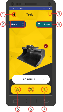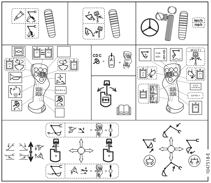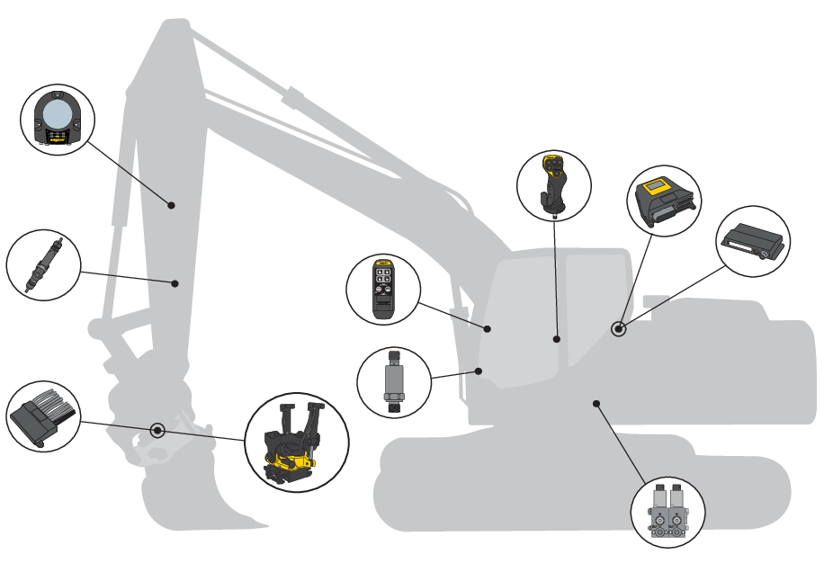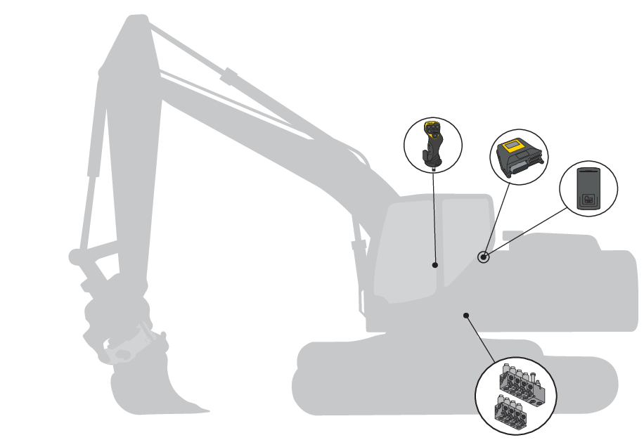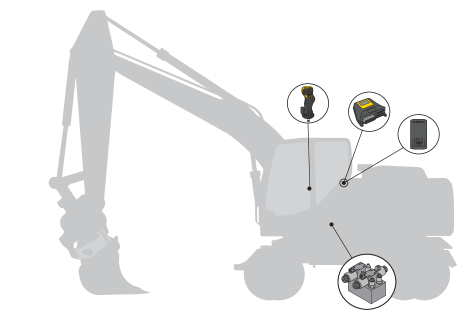Onderdeel voor bediening van het draaikantelstuk en de functies ervan. In sommige gevallen wordt het besturingssysteem ook gebruikt voor bepaalde functies van de graafmachine.