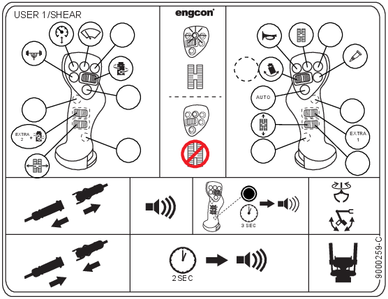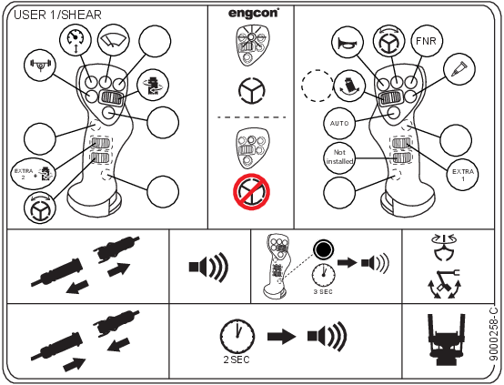 De solenoïdes van de werktuigvergrendelingen op de snelwissel mogen alleen van stroom worden voorzien wanneer beide activeringsknoppen voor de werktuigvergrendeling gelijktijdig worden ingedrukt.