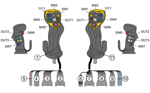 Knappar och rullar i översikten är illustrerade med samma färger som dess tillhörande kablar.