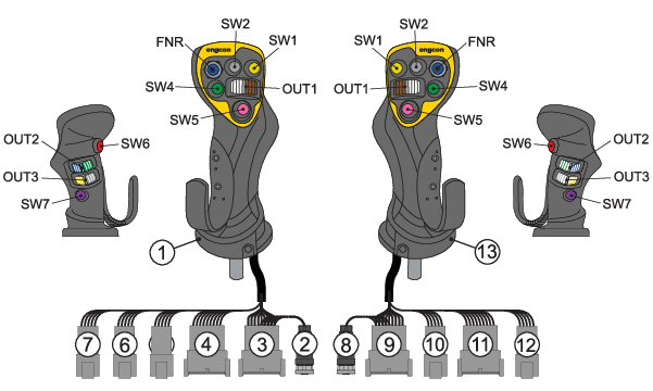 Knappar och rullar i översikten är illustrerade med samma färger som dess tillhörande kablar.