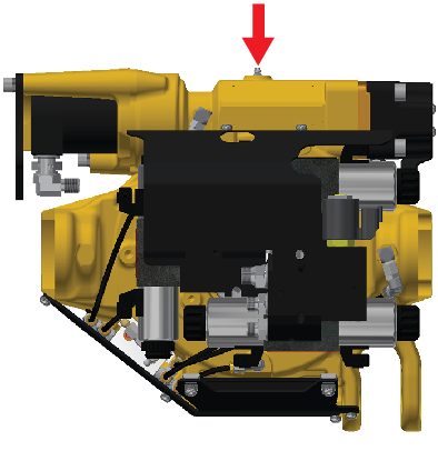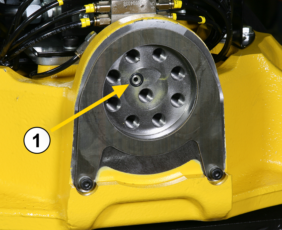 1. Zorg ervoor dat het kantelbovenstuk tegen de basismachine staat met behulp van een gereedschap met een wigeffect. Wig tussen het rotatorframe en het kantelbovenstuk bij de kantelas die van de cabine afwijst.