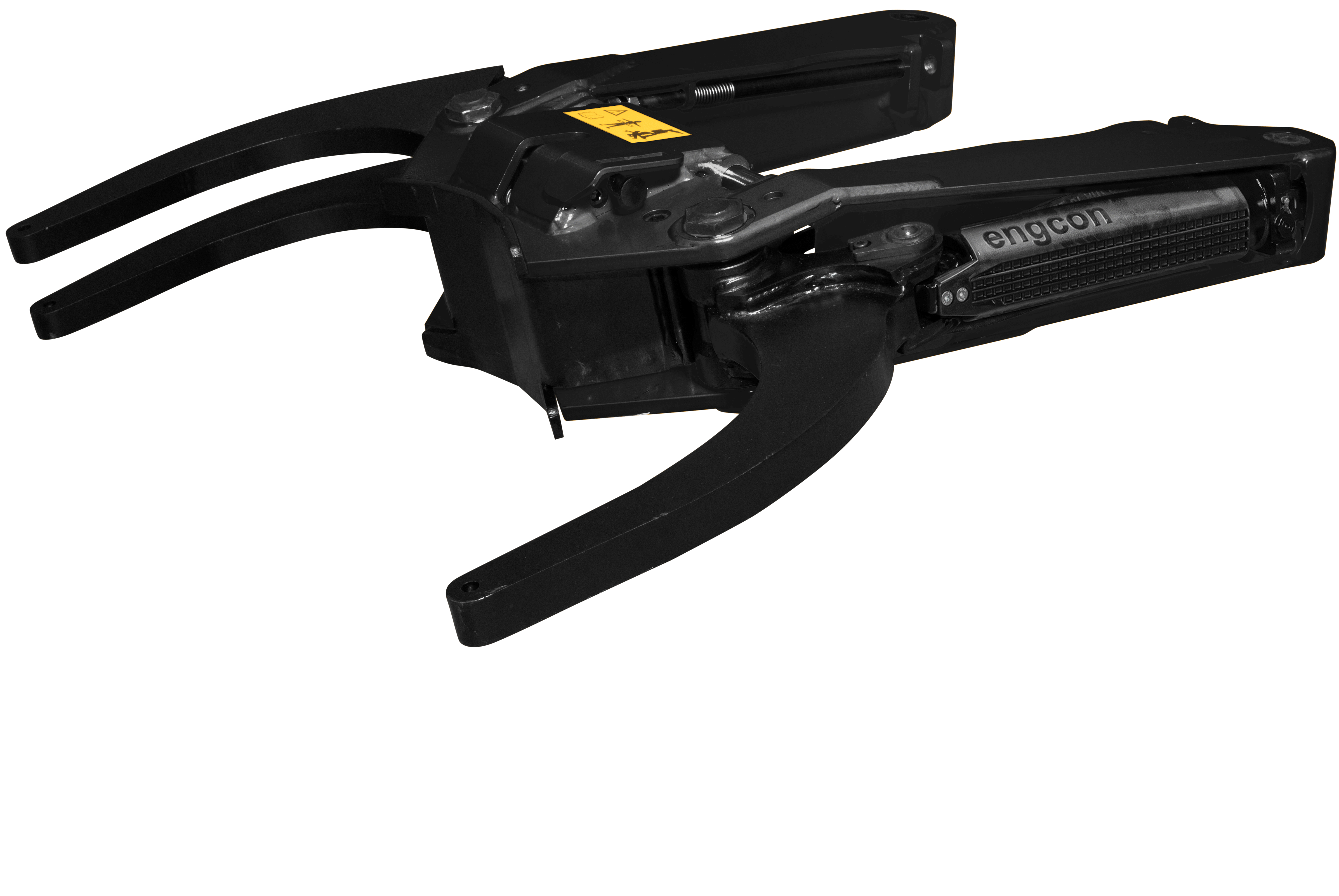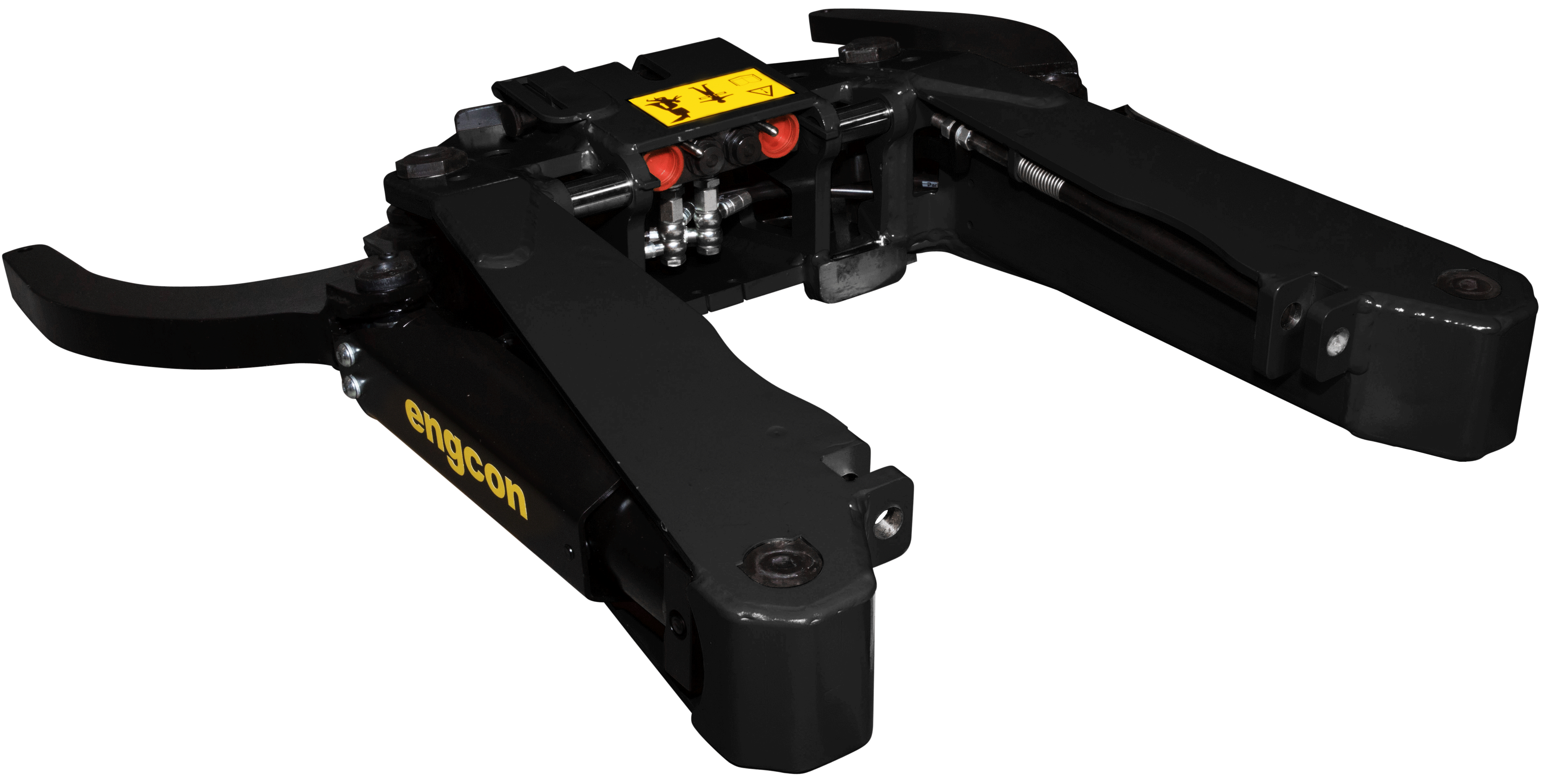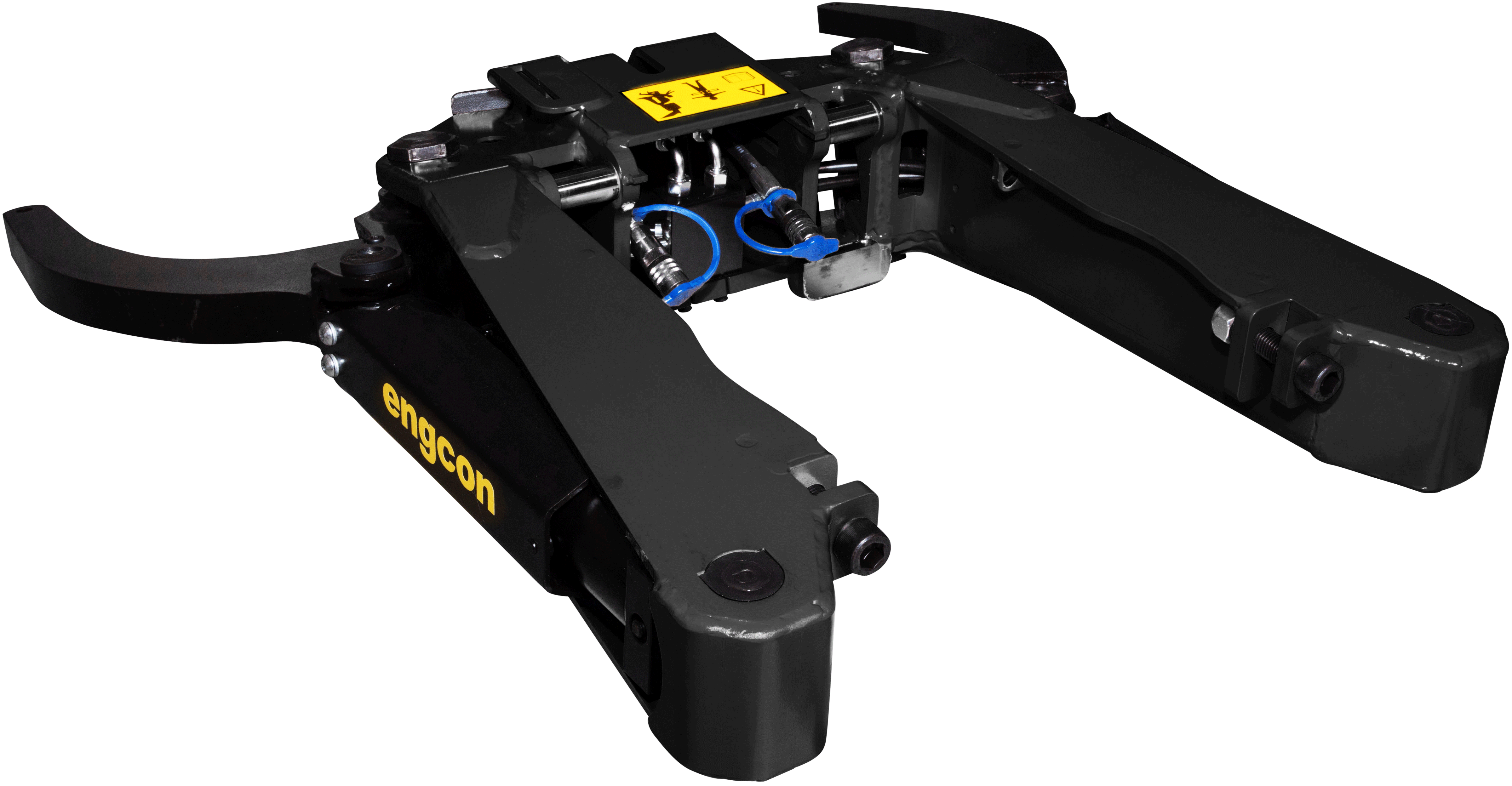 De grijpercassette wordt vergrendeld door middel van bouten en moeren aan het achterste deel van de werktuigbevestiging. Het hydraulische gedeelte wordt handmatig aangesloten door middel van slangkoppelingen.
