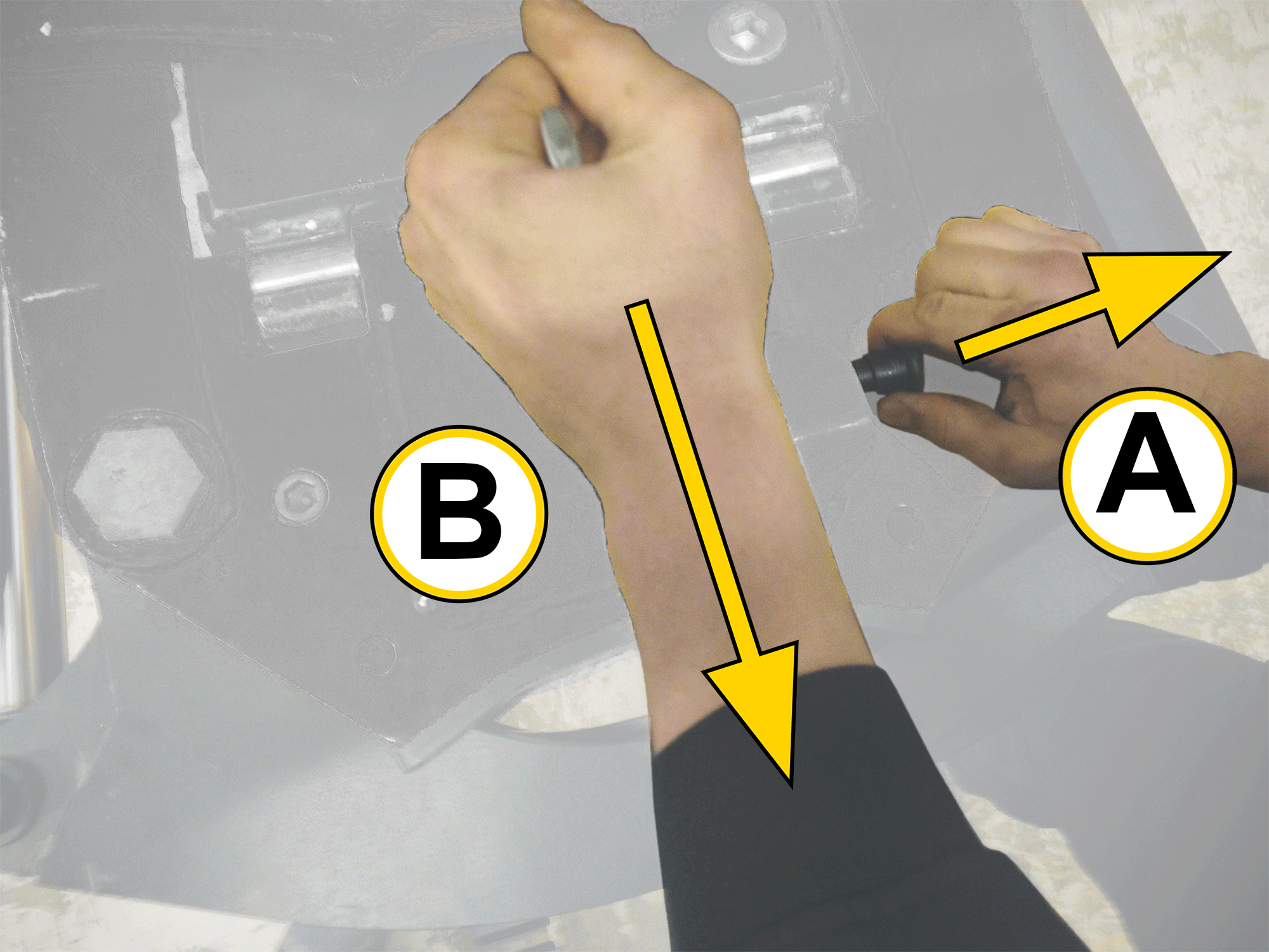 A: Trek de borgpen naar buiten. B: Draai de moer van de excentrische vergrendeling naar u toe. Als er zware weerstand is, controleer dan punt 5. |