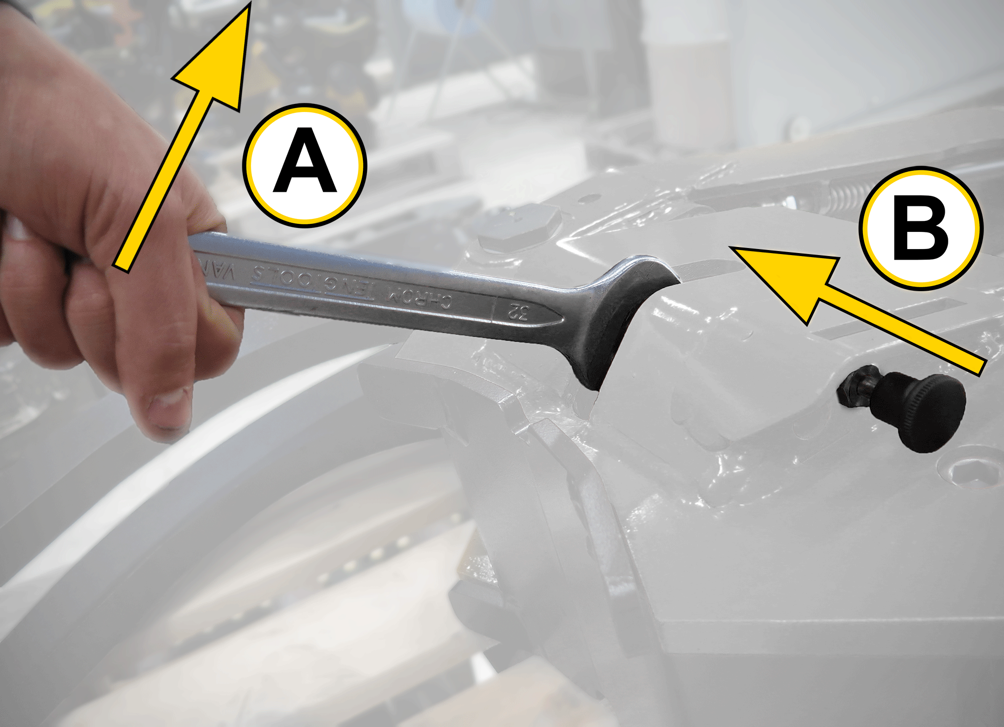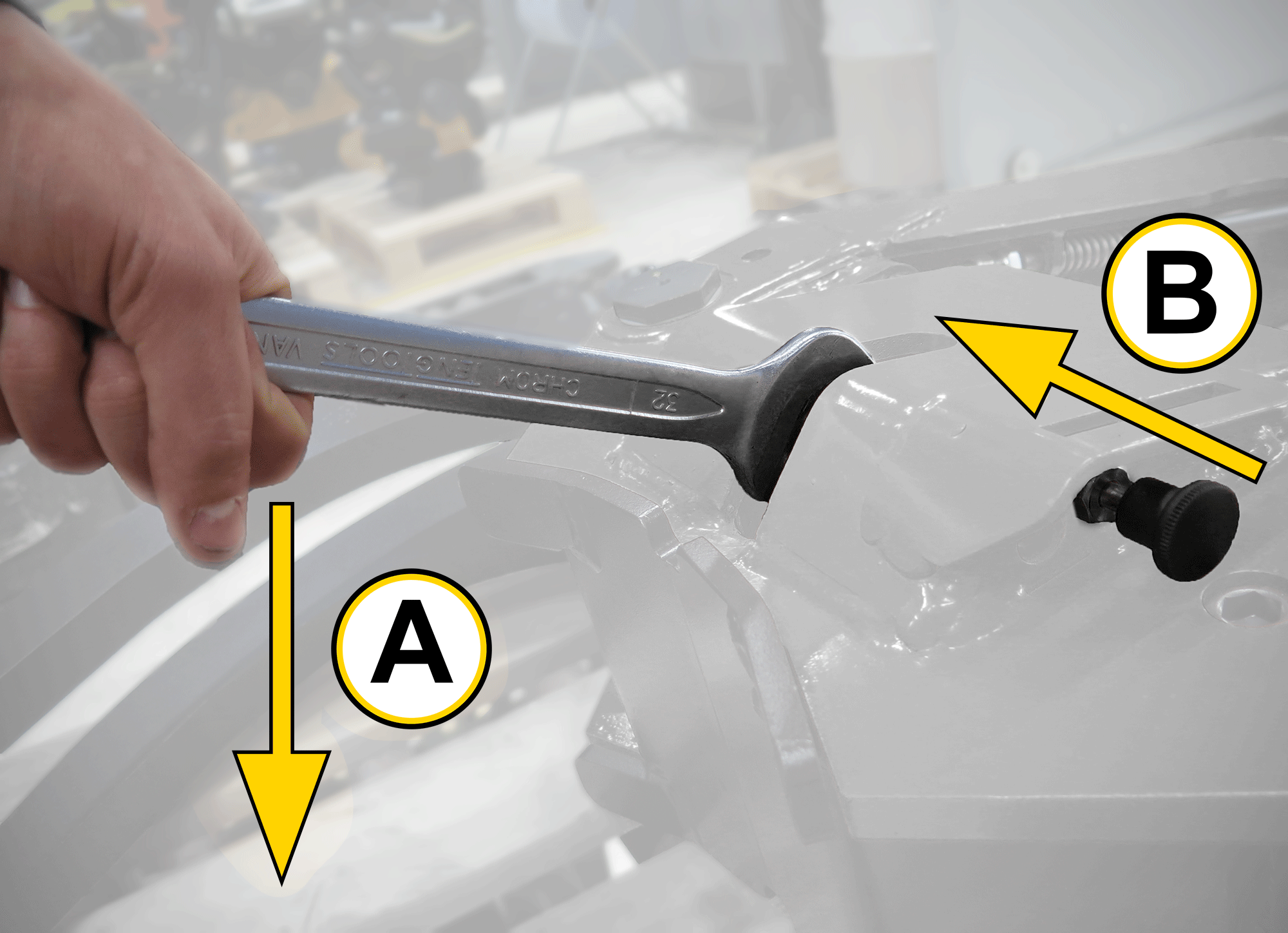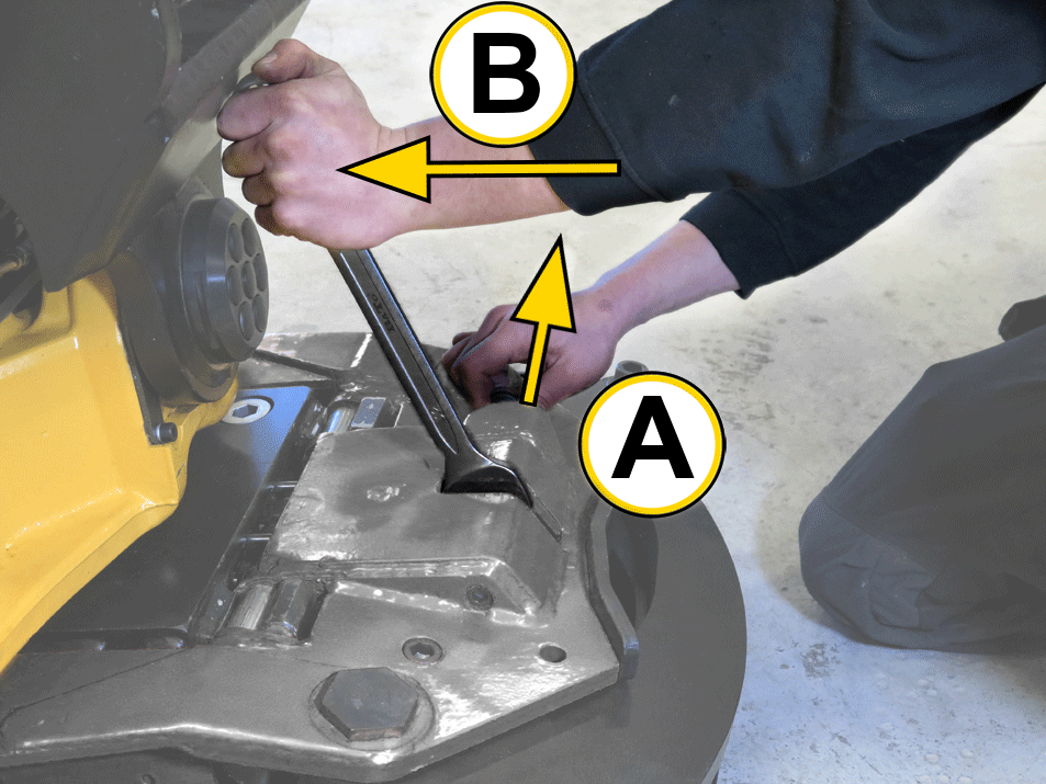A: Trek de vergrendeling uit (geldt niet voor GRD40). B: Draai de moer voor de excentervergrendeling van u af met behulp van de ringsleutel. Doe dat opnieuw om de vergrendeling volledig te openen. |