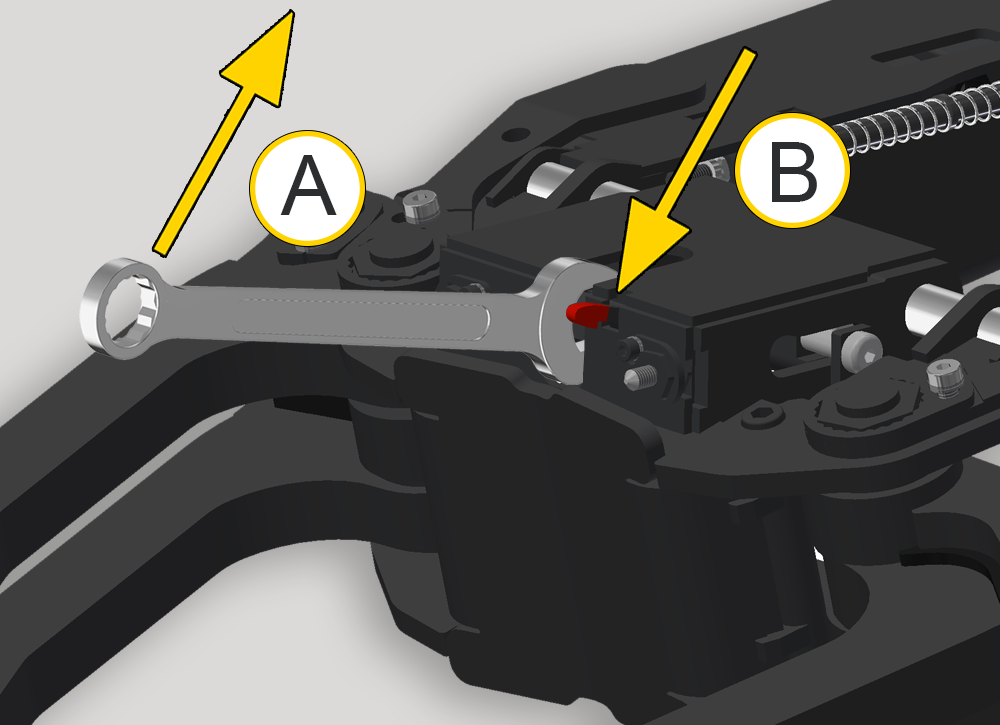 A: Draai met de ringsleutel de moer van u af totdat het blok open staat. B: Controleer of de rode haak zichtbaar is. |