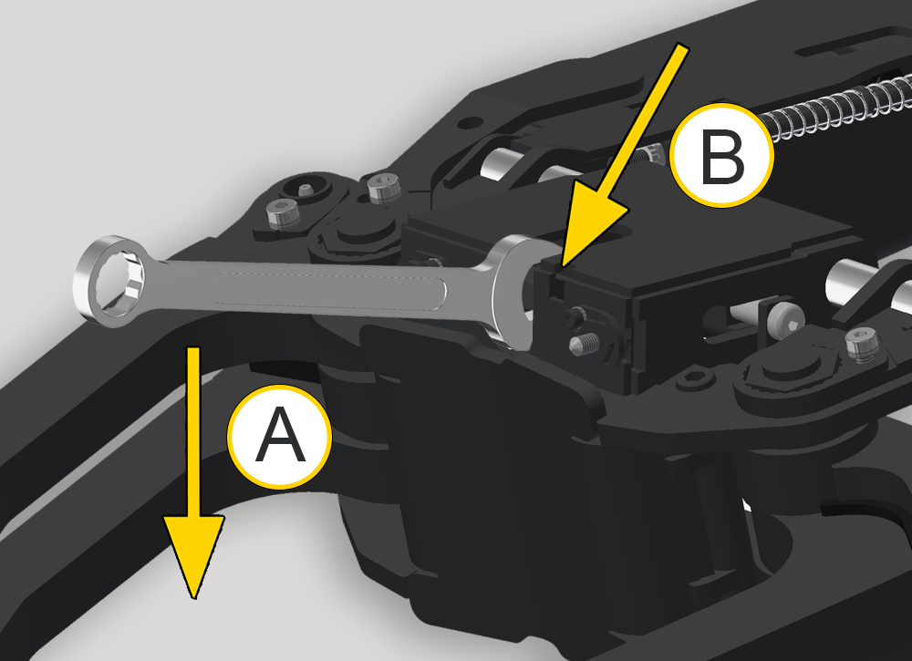 A: Zet de ringsleutel over de moer en trek naar u toe totdat de vergrendeling weer in de vergrendelde stand klikt. B: Controleer of de vergrendeling correct is vergrendeld. |