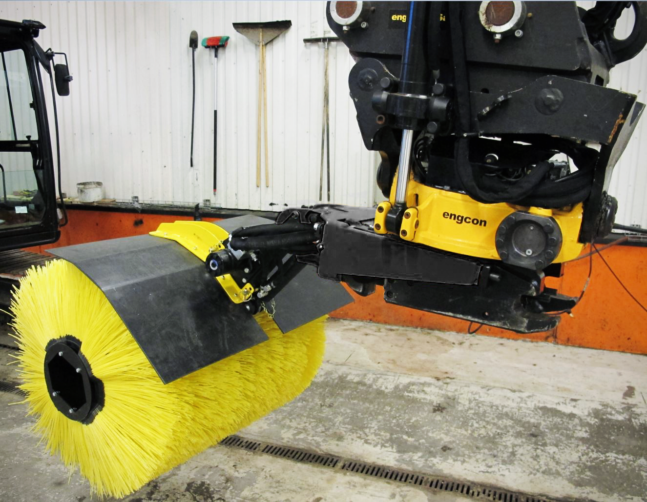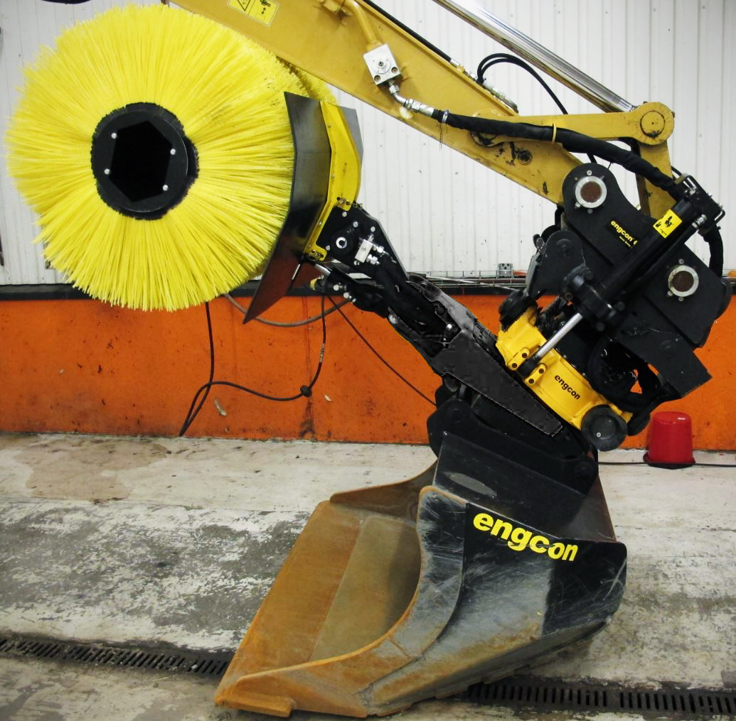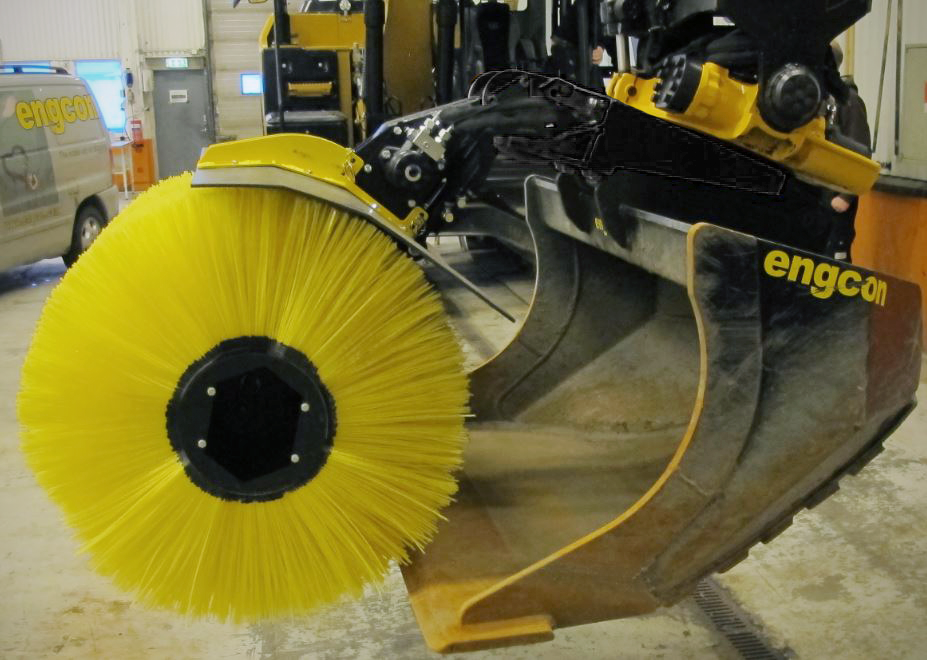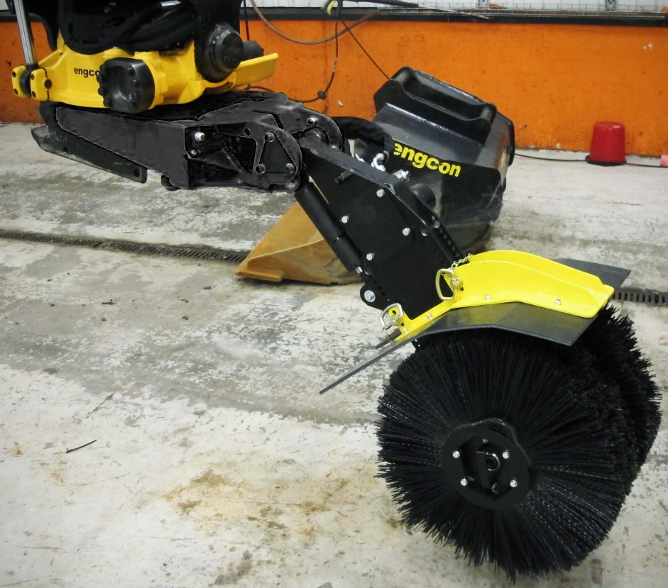 De afneembare veegcassette van engcon haakt op eenvoudige wijze vast in de QSD/QSM-gereedschapsbevestiging. De veegcassette is bedoeld voor het reinigen van voorwerpen die zijn bedekt met grond, zand, sneeuw of iets dergelijks. Bijvoorbeeld kabels en buizen. De veegcassette is ook bedoeld voor het schoonvegen van bijvoorbeeld wandel- en fietspaden, oversteekplaatsen, wissels en grasmatten.