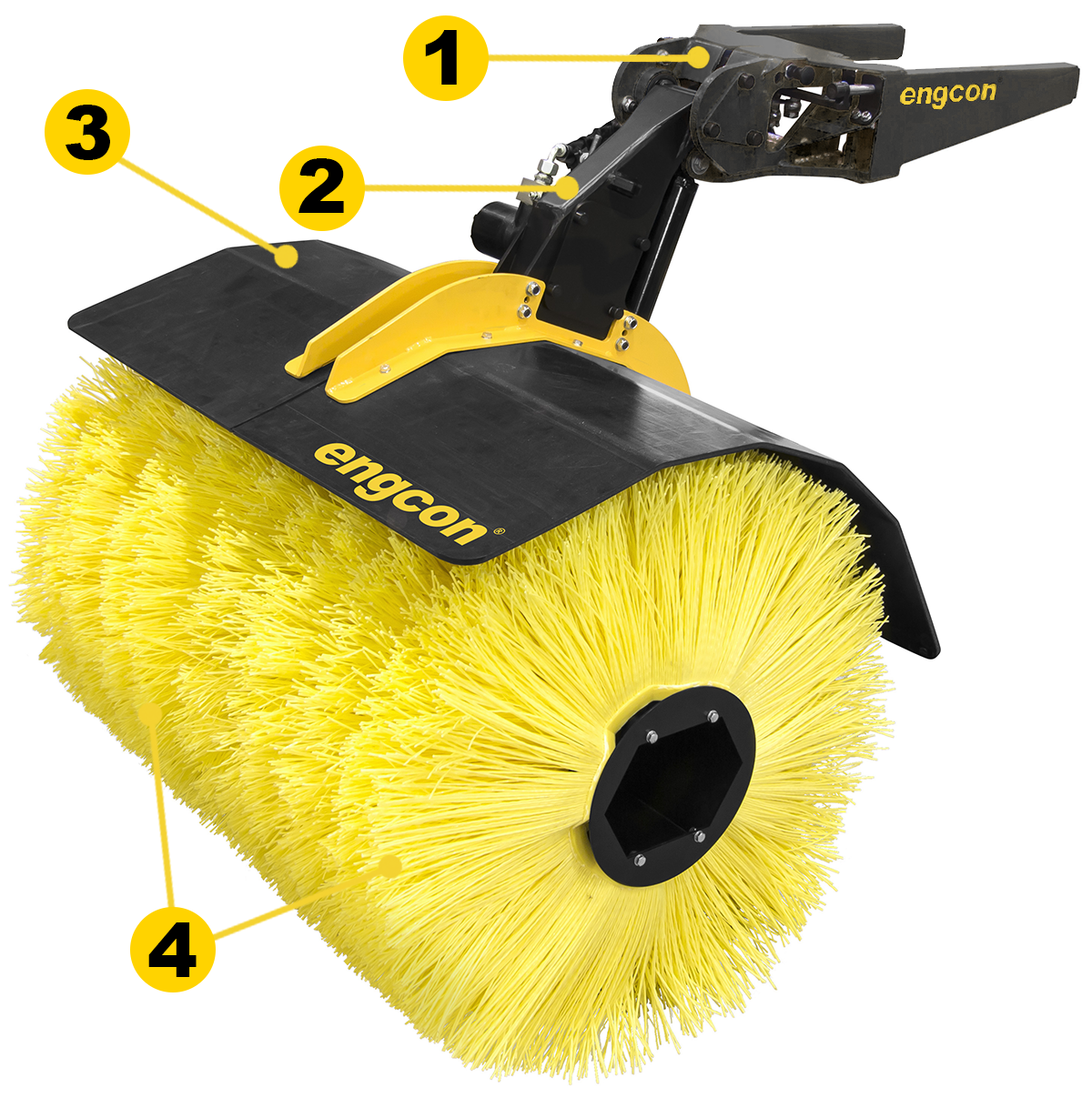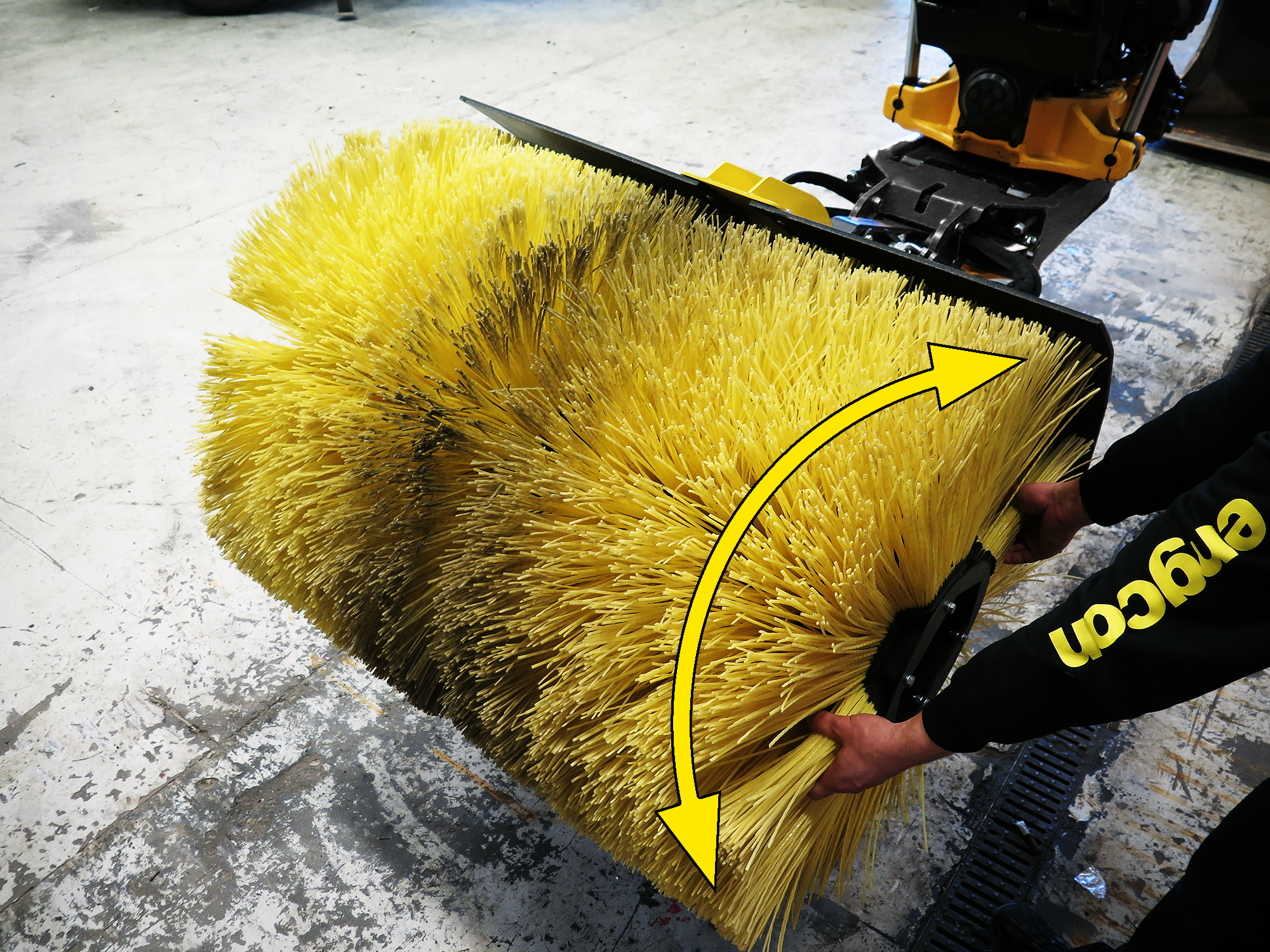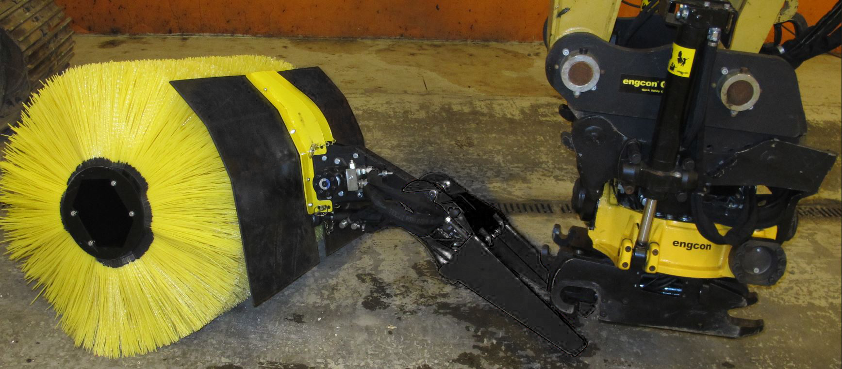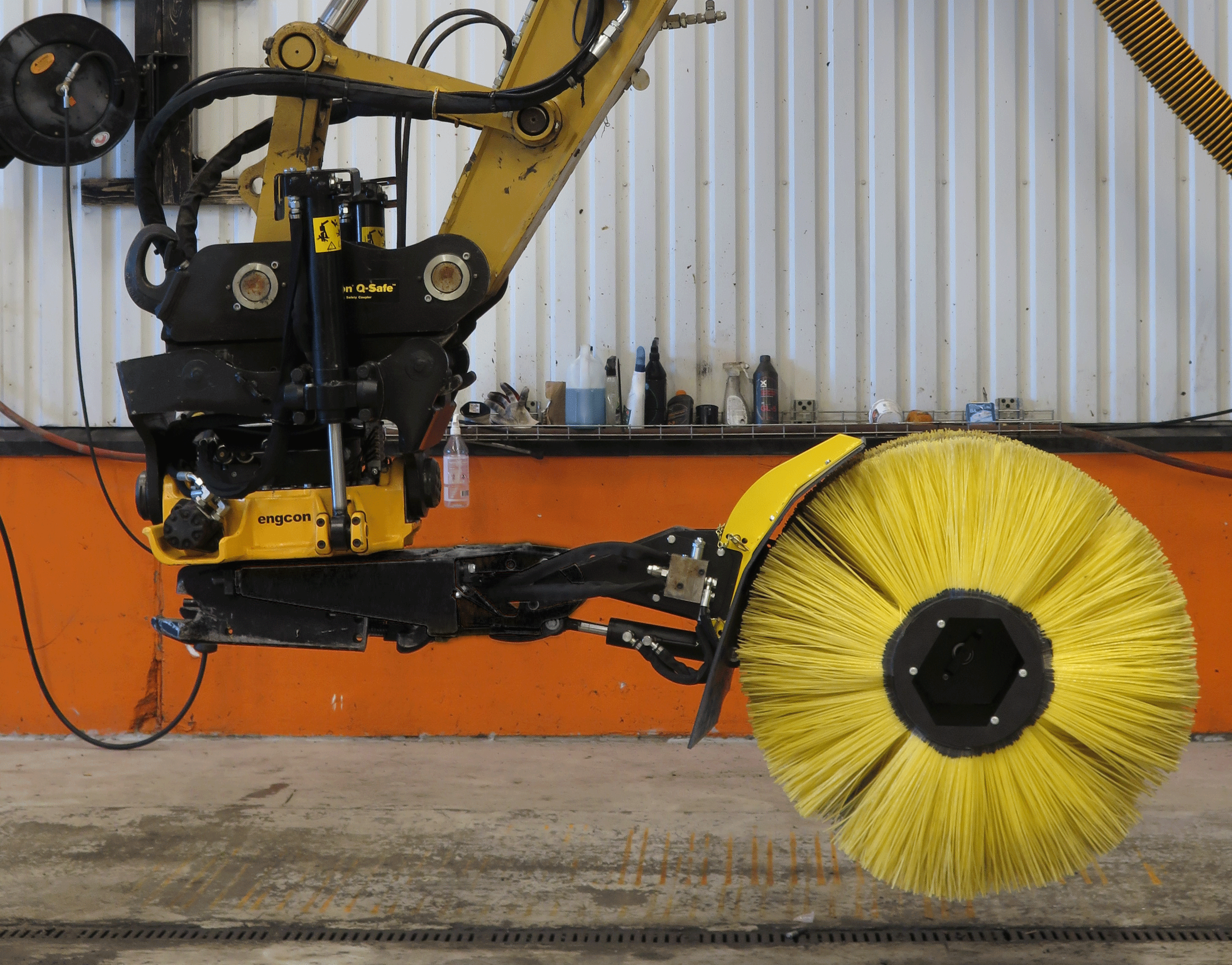 De afneembare veegcassette van engcon haakt op eenvoudige wijze vast in de QSD/QSM-gereedschapsbevestiging. De veegcassette is bedoeld voor het reinigen van voorwerpen die zijn bedekt met grond, zand, sneeuw of iets dergelijks. Bijvoorbeeld kabels en buizen. De veegcassette is ook bedoeld voor het schoonvegen van bijvoorbeeld wandel- en fietspaden, oversteekplaatsen, wissels en grasmatten.