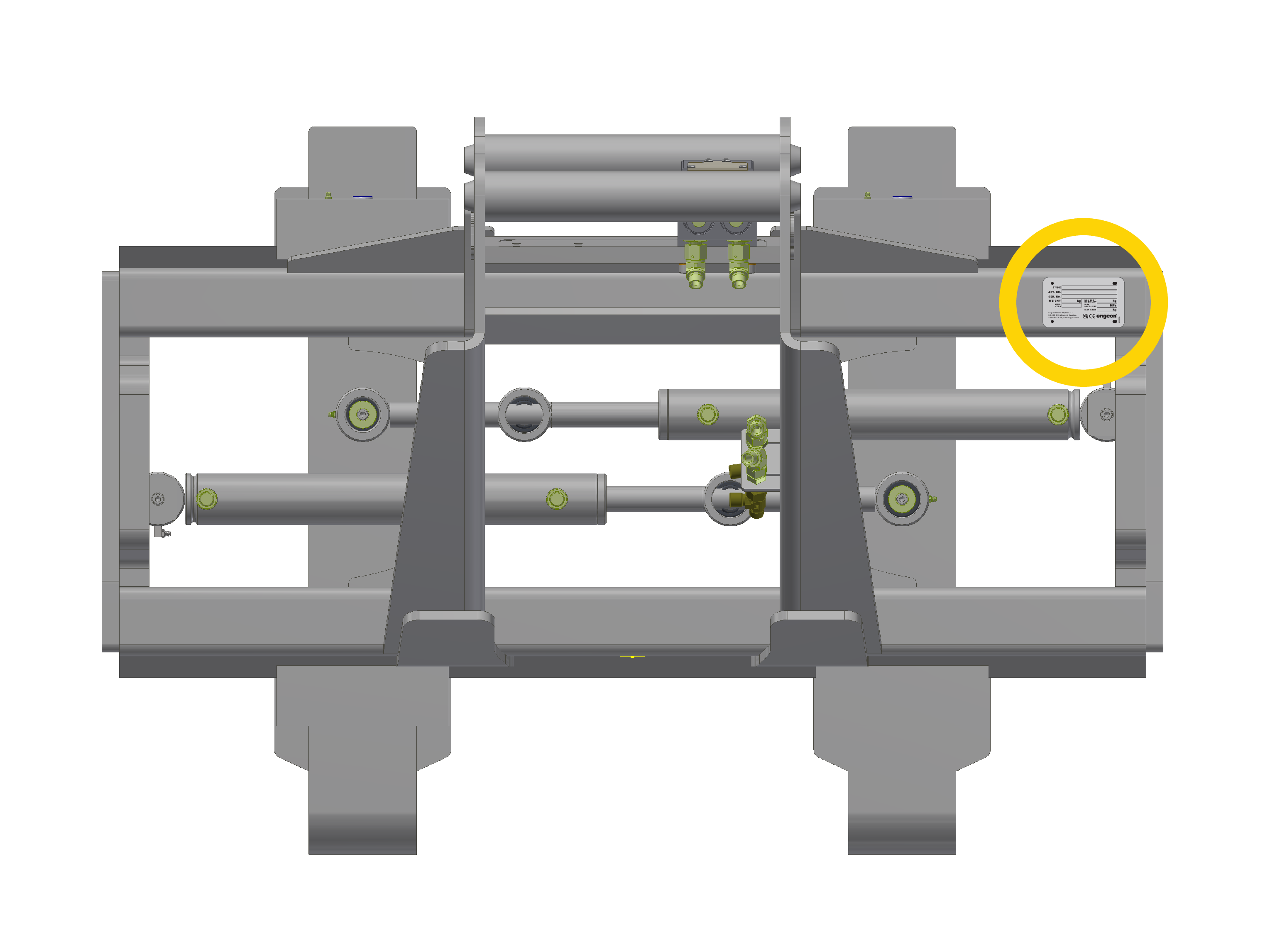 Dit product is ontworpen, gedimensioneerd en gefabriceerd door engcon. Modificatie, wijziging of ombouw van dit werktuig waardoor het niet meer aan de specificaties van de fabrikant voldoet, is niet toegestaan. Voor vervanging van componenten of reparaties, neem contact op met een erkende werkplaats. Garantie: 1 jaar onder voorwaarde dat het werktuig niet aan overmatig geweld is blootgesteld, of op andere niet normale wijze is behandeld.